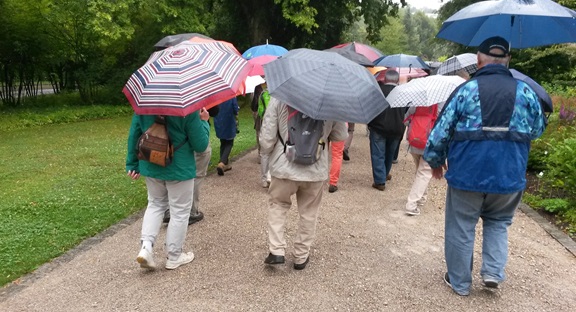 Bisher hatten wir nur leichten Regen, doch als wir gegen 11 Uhr in Weihenstephan ankamen, regnete es wie aus Gießkannen. Unter unseren Schirmen verstanden wir kaum die Erläuterungen der beiden Referenten, die uns in zwei Gruppen durch den mehr als 50.000 m² großen Sichtungsgarten führten.